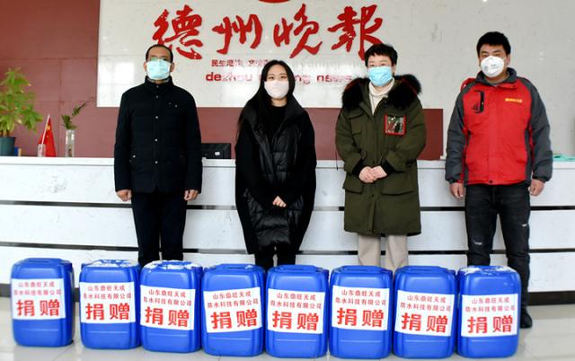 2月6日,德州市慈善义工联合会联合山东鼎旺天成防水科技有限公司捐赠12吨消毒液和酒精,用于武汉和德州的疫情防控工作。当天,德州市慈善义工联合会会长桂大智和山东鼎旺天成防水科技有限公司董事长宋华杰将捐赠给德州的消毒液和酒精送到相关单位。同时,送往武汉的消毒液已经与相关部门联系好,近期将送到物资运输点。